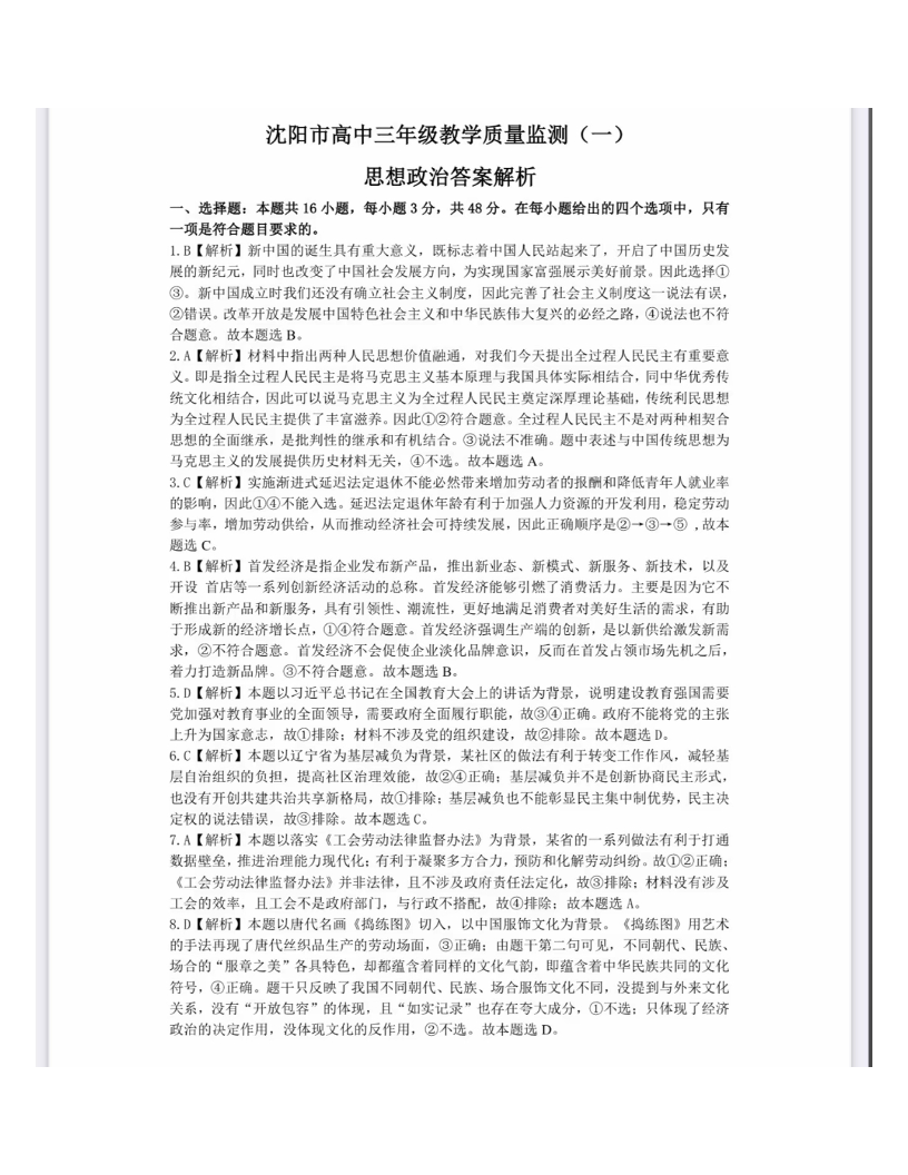 辽宁省沈阳市2025年高中三年级教学质量监测(一模)政治答案