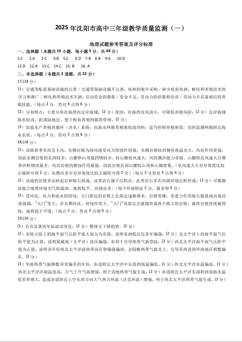 辽宁省沈阳市2025年高中三年级教学质量监测(一模)地理答案