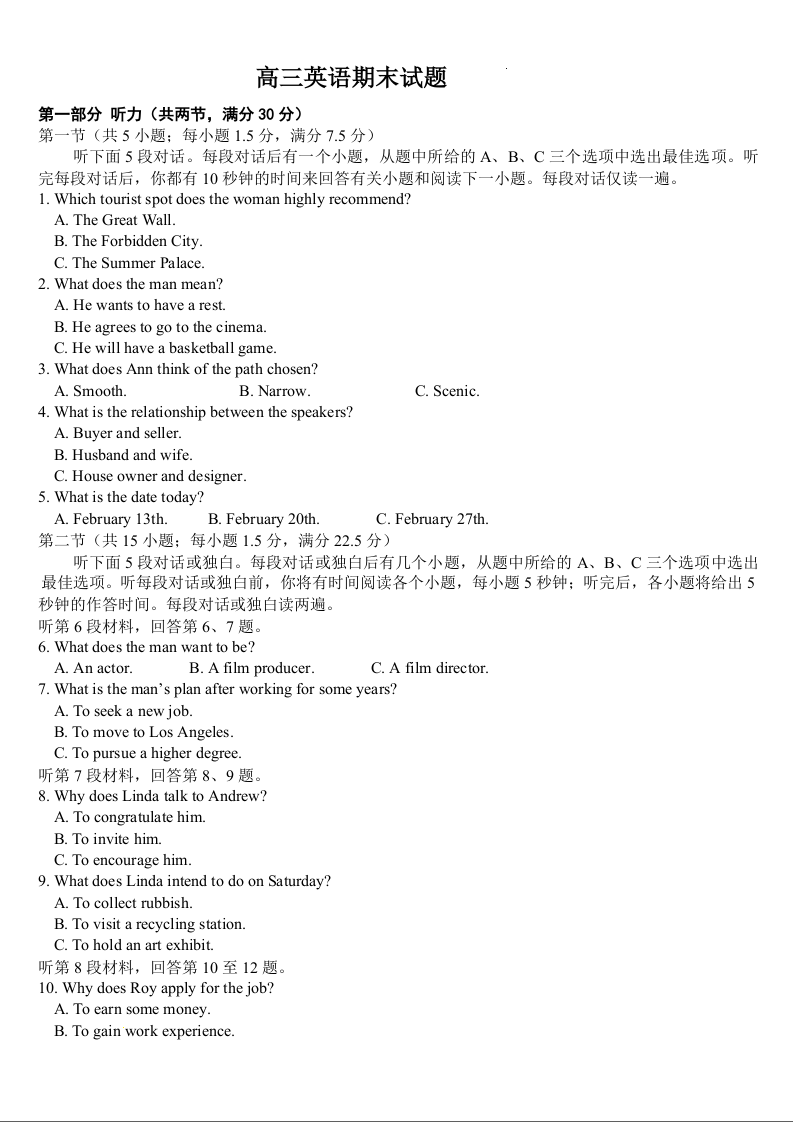 吉林省通化市梅河口市第五中学2025届高三上学期1月期末考试英语+答案