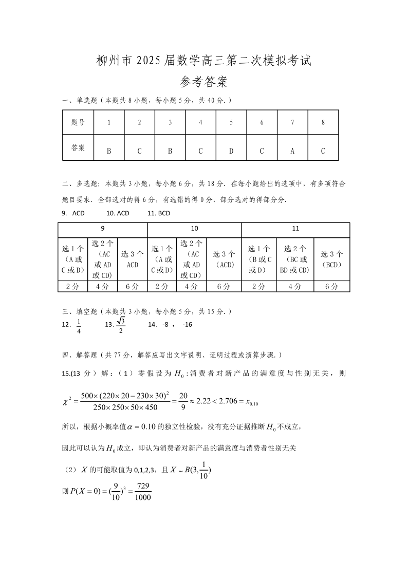 广西省柳州市2025届高三第二次模拟考试(二模)数学答案