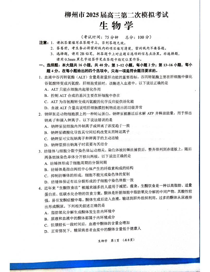 广西省柳州市2025届高三第二次模拟考试(二模)生物