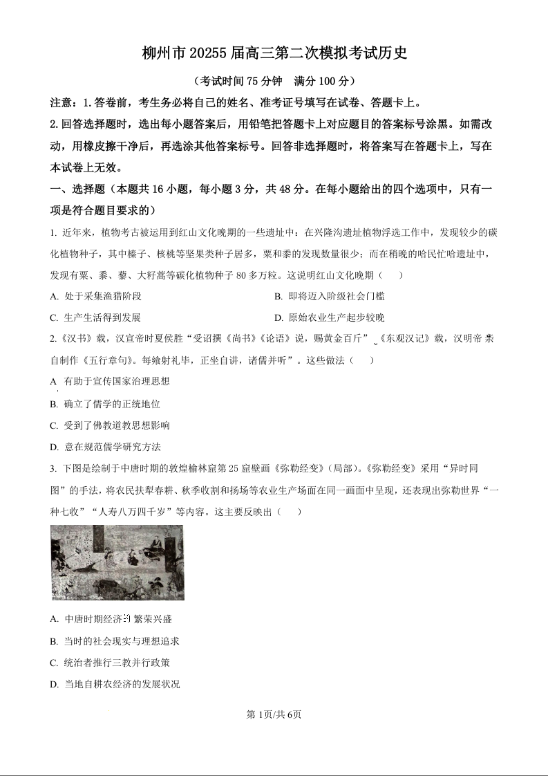 广西省柳州市2025届高三第二次模拟考试(二模)历史(原卷版)