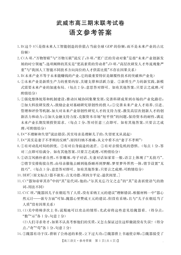 甘肃省武威市2025届高三上学期1月期末联考语文答案