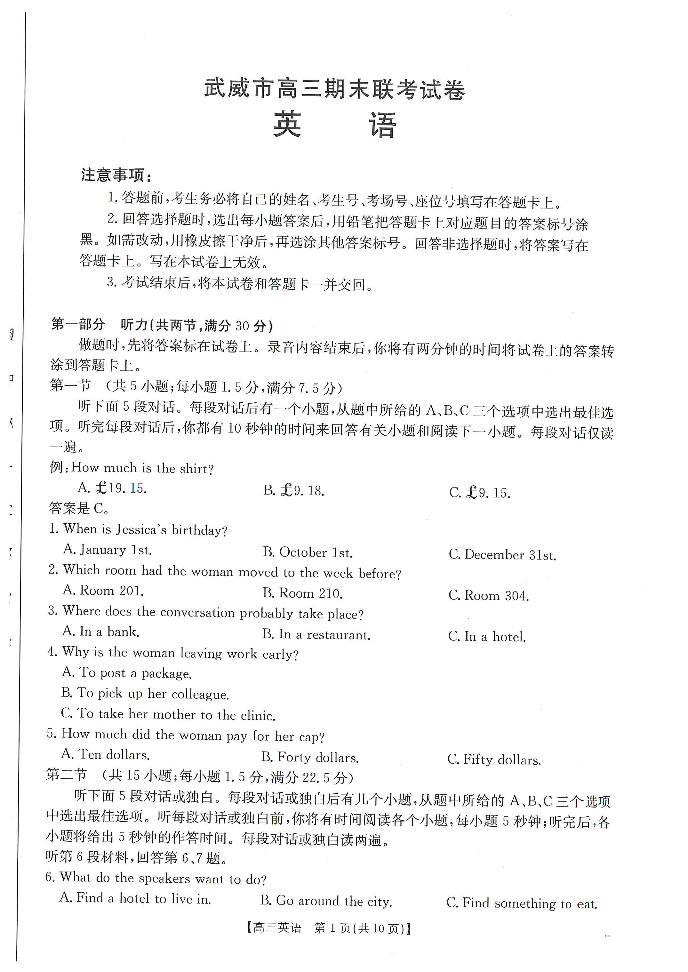 甘肃省武威市2025届高三上学期1月期末联考英语