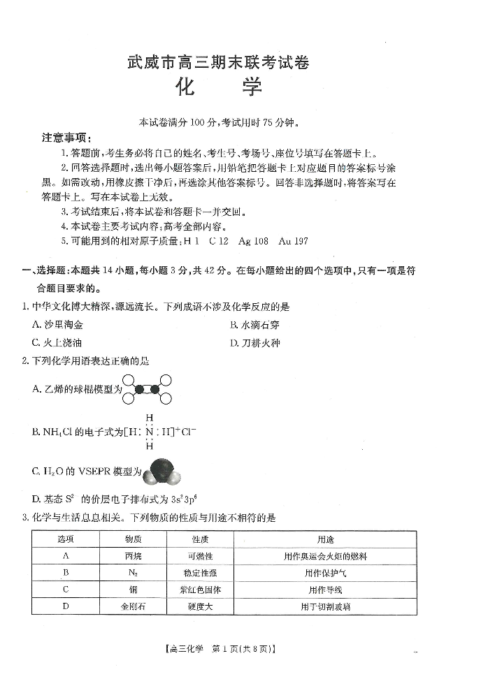 甘肃省武威市2025届高三上学期1月期末联考化学