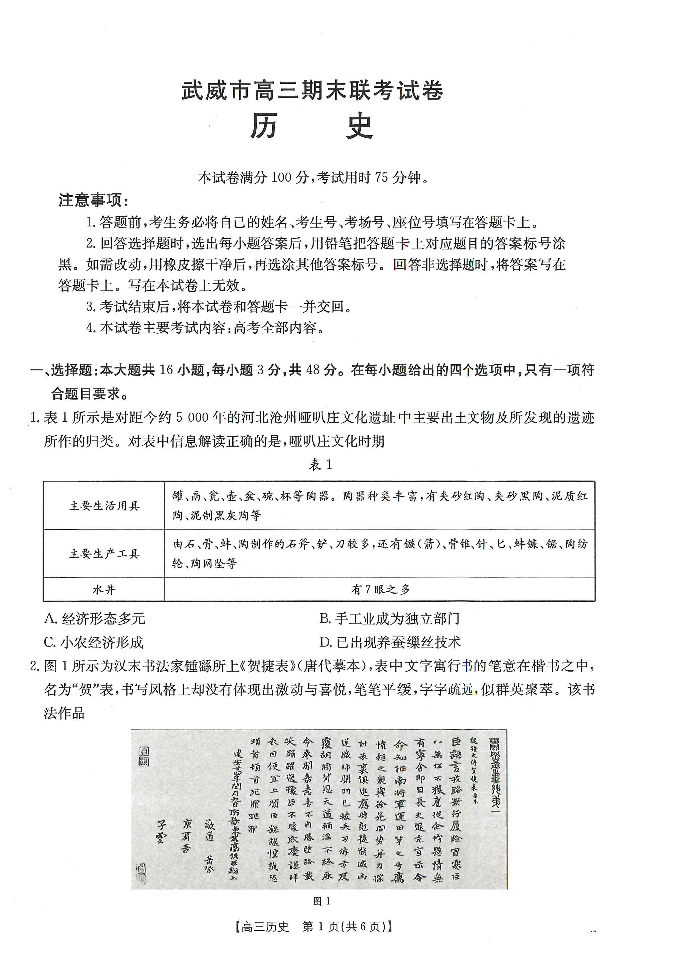 甘肃省武威市2025届高三上学期1月期末联考历史