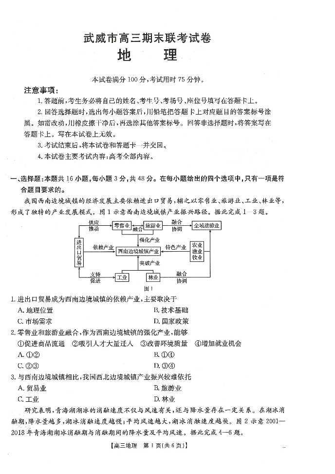 甘肃省武威市2025届高三上学期1月期末联考地理