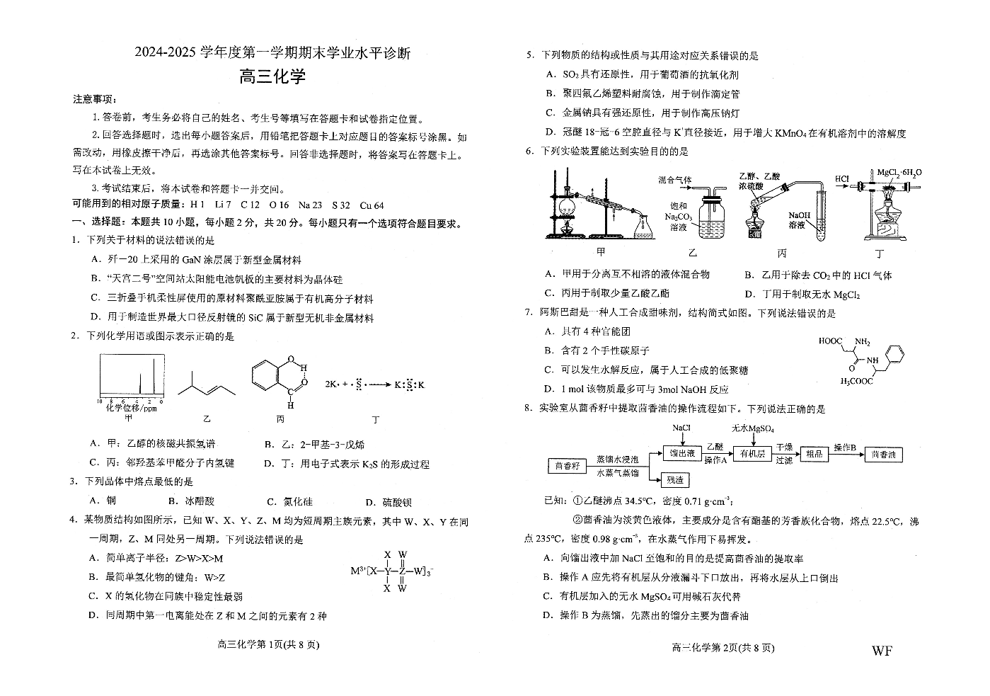 山东省烟台市2024-2025学年第一学期高三期末学业水平诊断化学