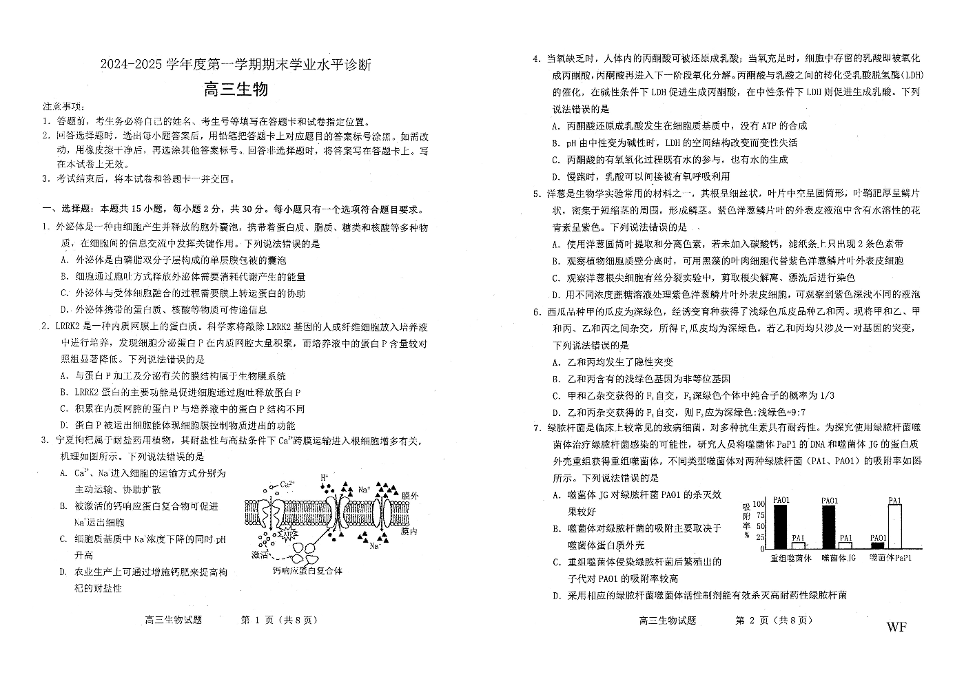 山东省烟台市2024-2025学年第一学期高三期末学业水平诊断生物