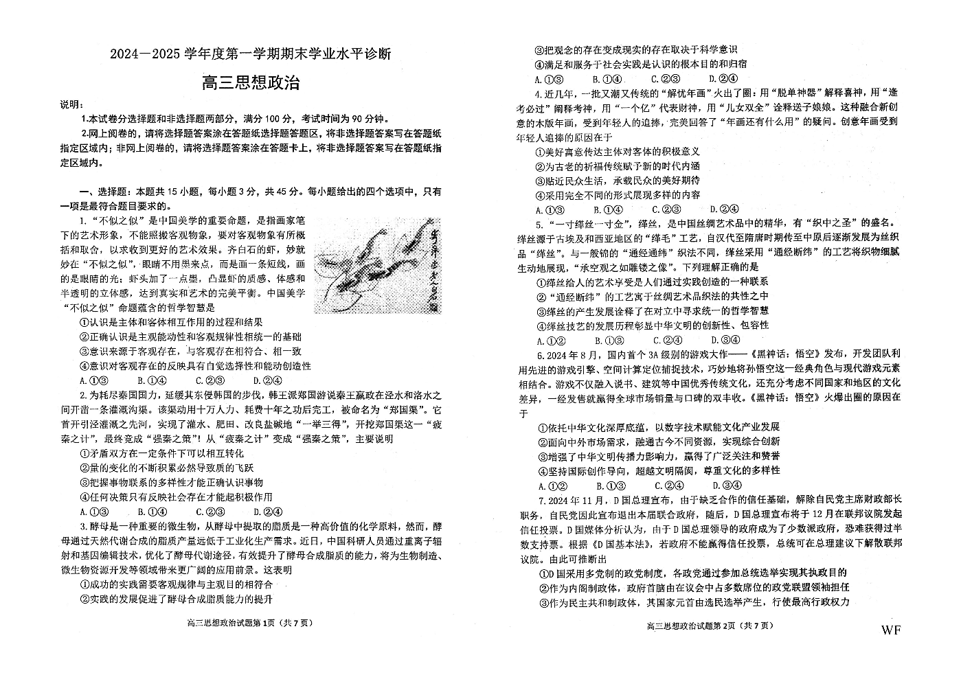 山东省烟台市2024-2025学年第一学期高三期末学业水平诊断政治