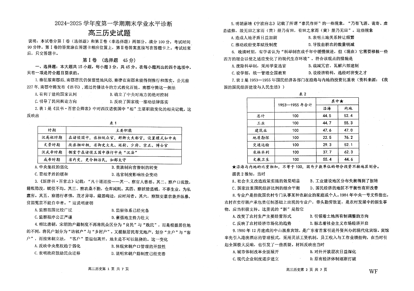 山东省烟台市2024-2025学年第一学期高三期末学业水平诊断历史