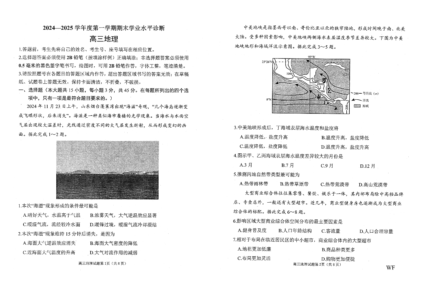 山东省烟台市2024-2025学年第一学期高三期末学业水平诊断地理