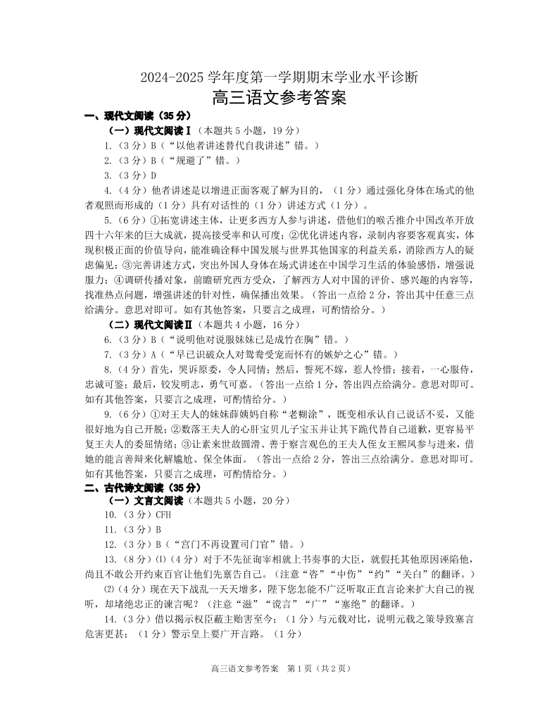 山东省烟台市2024-2025学年第一学期高三期末学业水平诊断语文答案