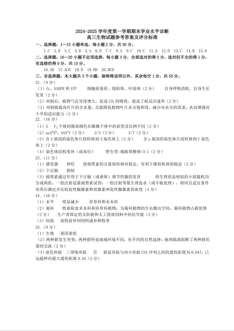 山东省烟台市2024-2025学年第一学期高三期末学业水平诊断生物答案