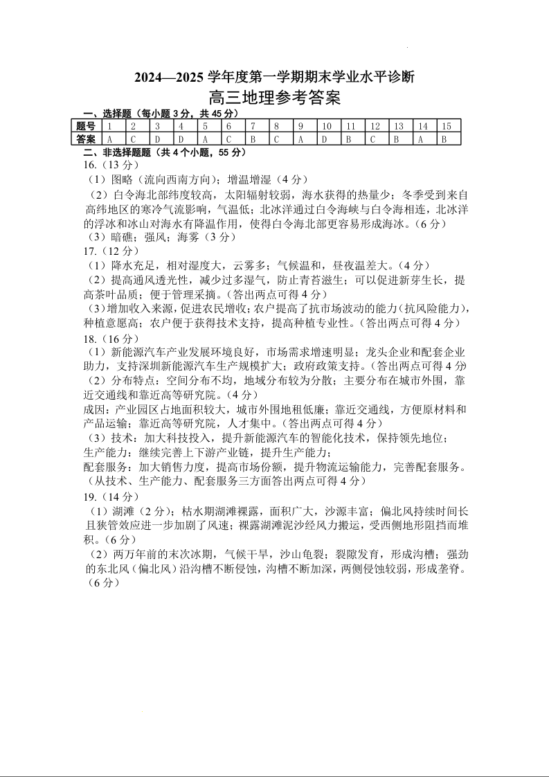 山东省烟台市2024-2025学年第一学期高三期末学业水平诊断地理答案