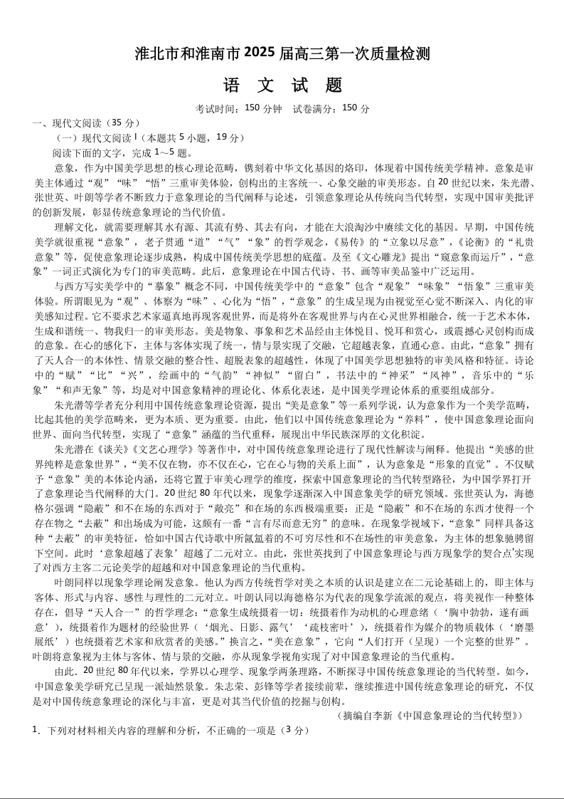 安徽省淮南市和淮北市2025届高三上学期第一次质量检测语文+答案