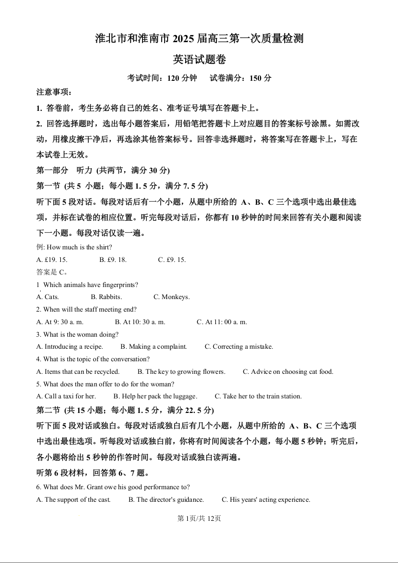 安徽省淮南市和淮北市2025届高三上学期第一次质量检测英语(原卷版)