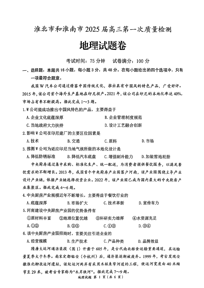 安徽省淮南市和淮北市2025届高三上学期第一次质量检测地理