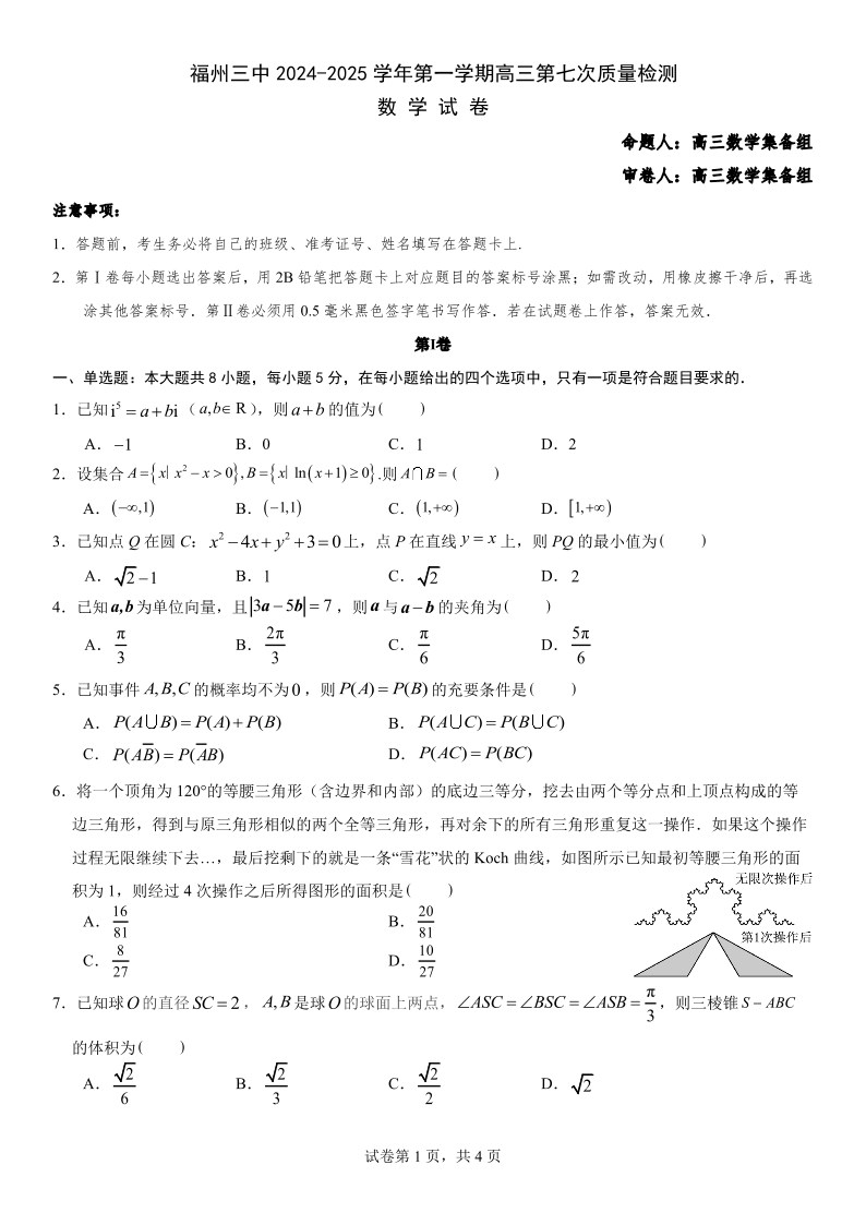 福建省福州第三中学2025届高三上学期第七次模拟数学