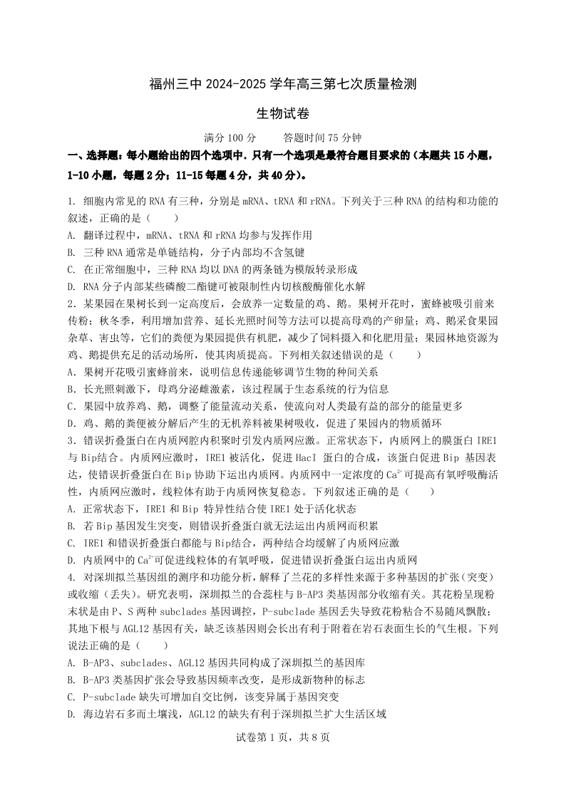 福建省福州第三中学2025届高三上学期第七次模拟生物
