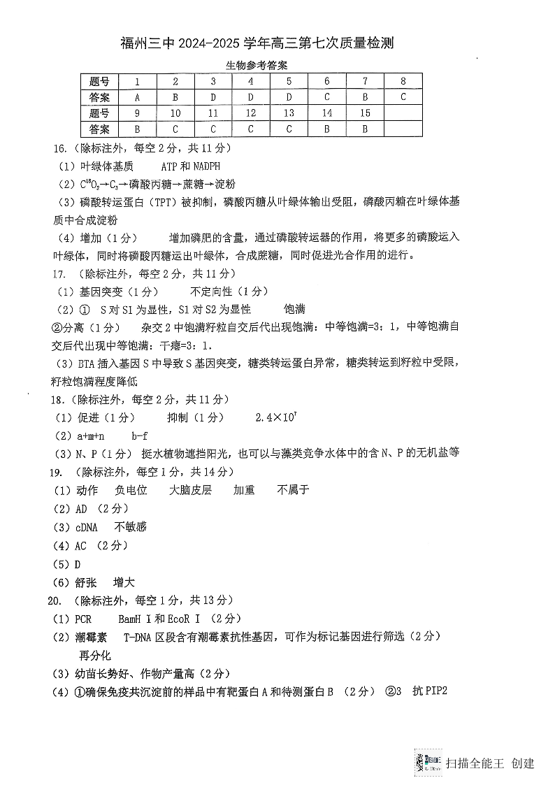 福建省福州第三中学2025届高三上学期第七次模拟生物答案