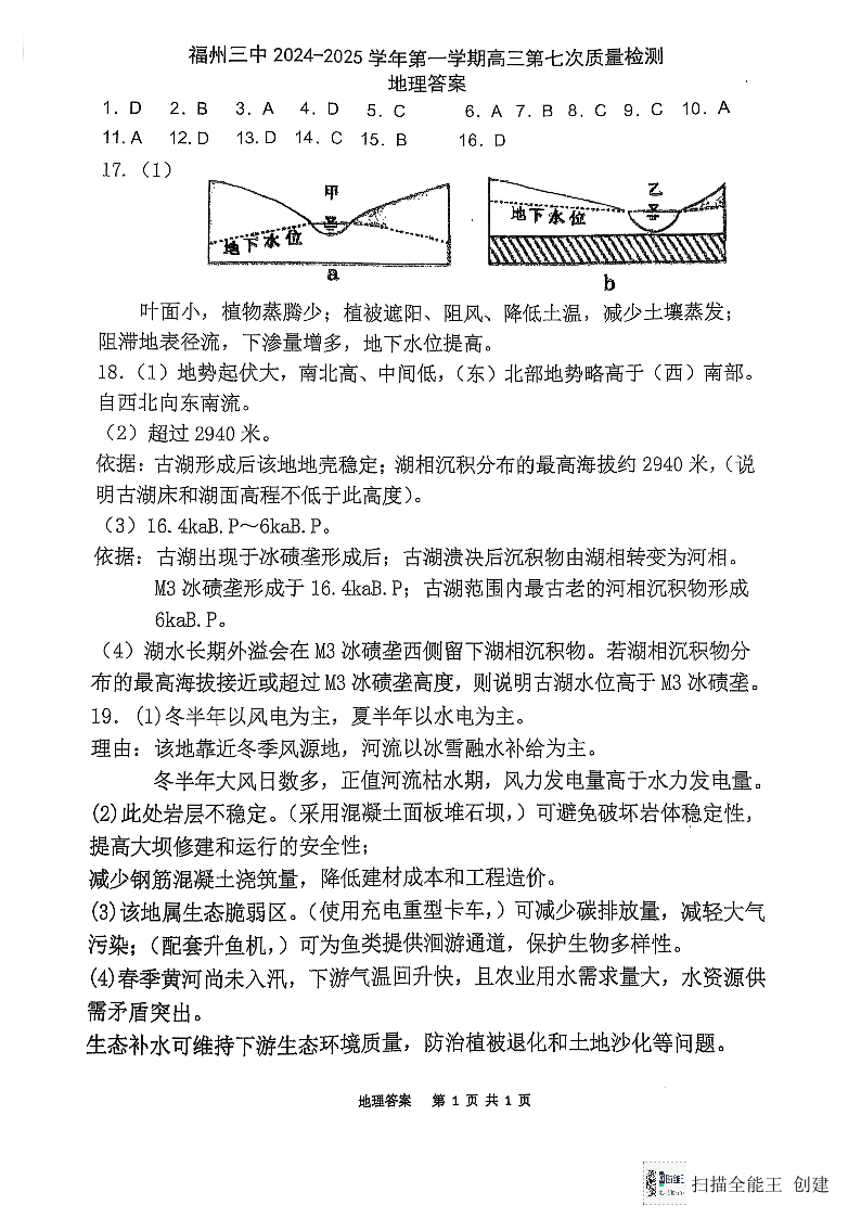 福建省福州第三中学2025届高三上学期第七次模拟地理答案