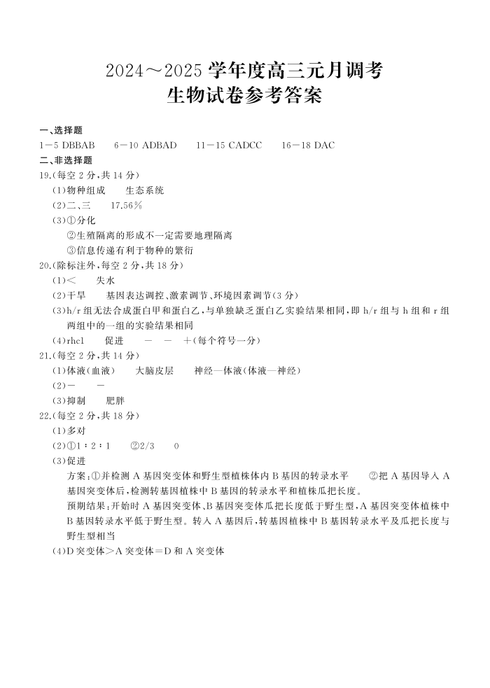 湖北省武汉市江岸区2025届高三上学期1月期末考试生物答案