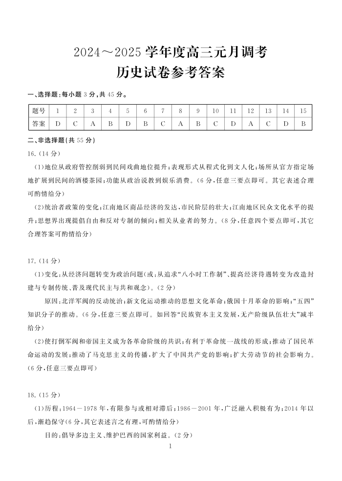 湖北省武汉市江岸区2025届高三上学期1月期末考试历史答案