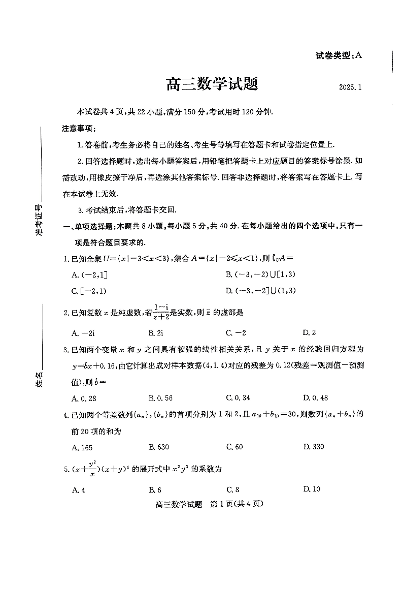 山东省滨州市2025届高三上学期1月期末考试数学