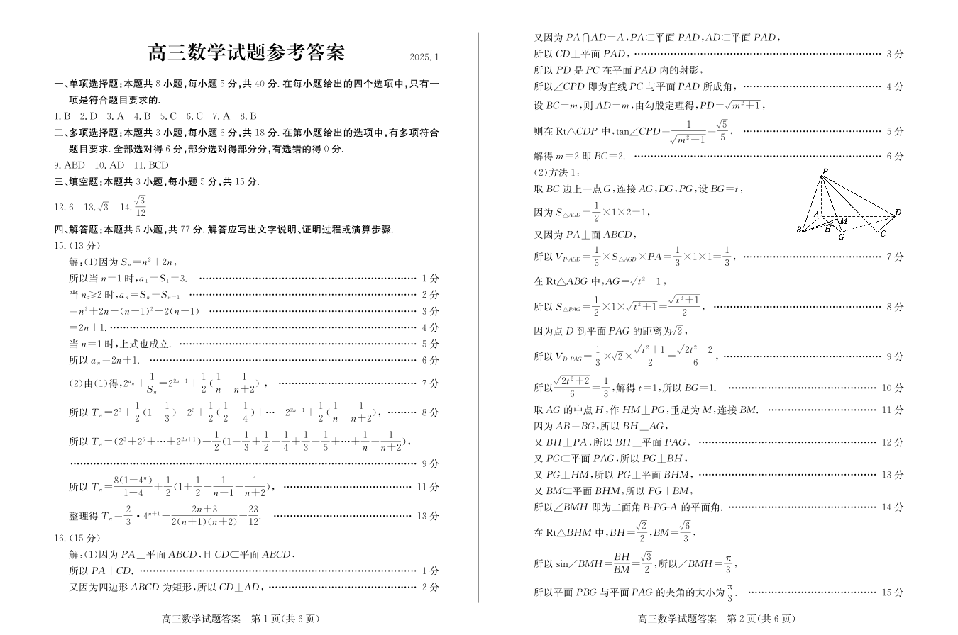 山东省滨州市2025届高三上学期1月期末考试数学答案