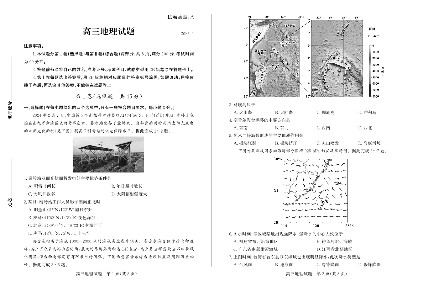山东省滨州市2025届高三上学期1月期末考试地理