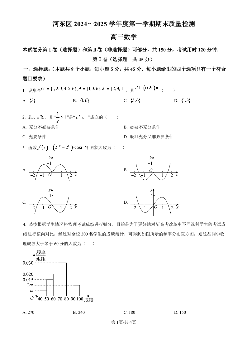 天津市河东区2025届高三上学期1月期末质量检测数学(原卷版)