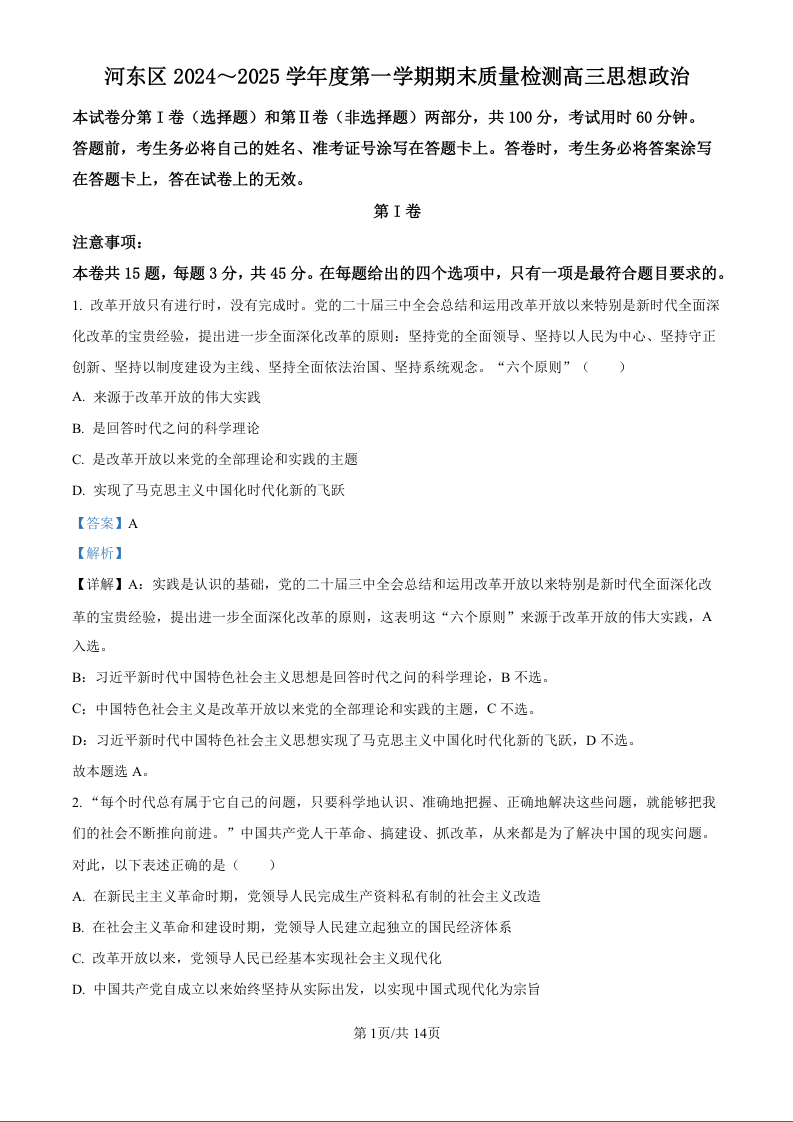天津市河东区2025届高三上学期1月期末质量检测政治(精品解析版)