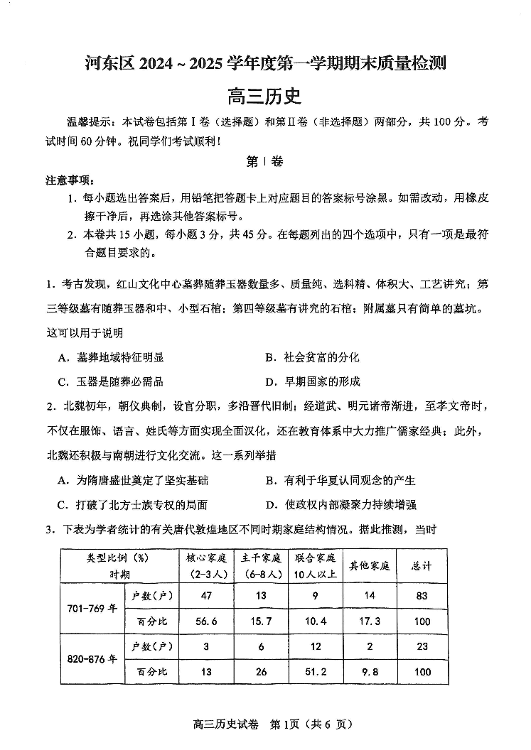 天津市河东区2025届高三上学期1月期末质量检测历史