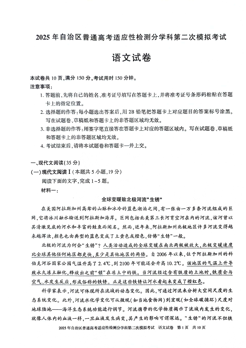 2025届新疆维吾尔自治区普通高考适应性检测分学科第二次模拟考试语文