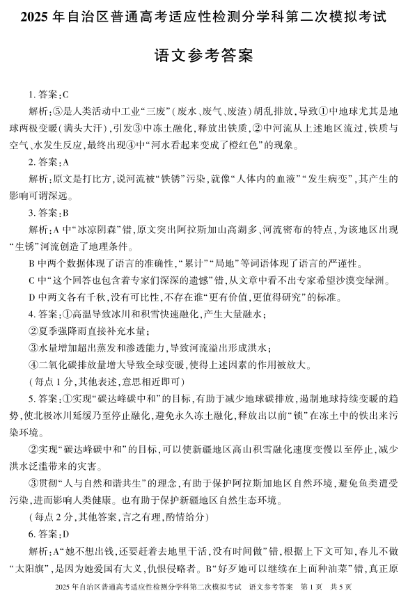 新疆维吾尔自治区2025届普通高考适应性检测分学科第二次模拟考试语文答案