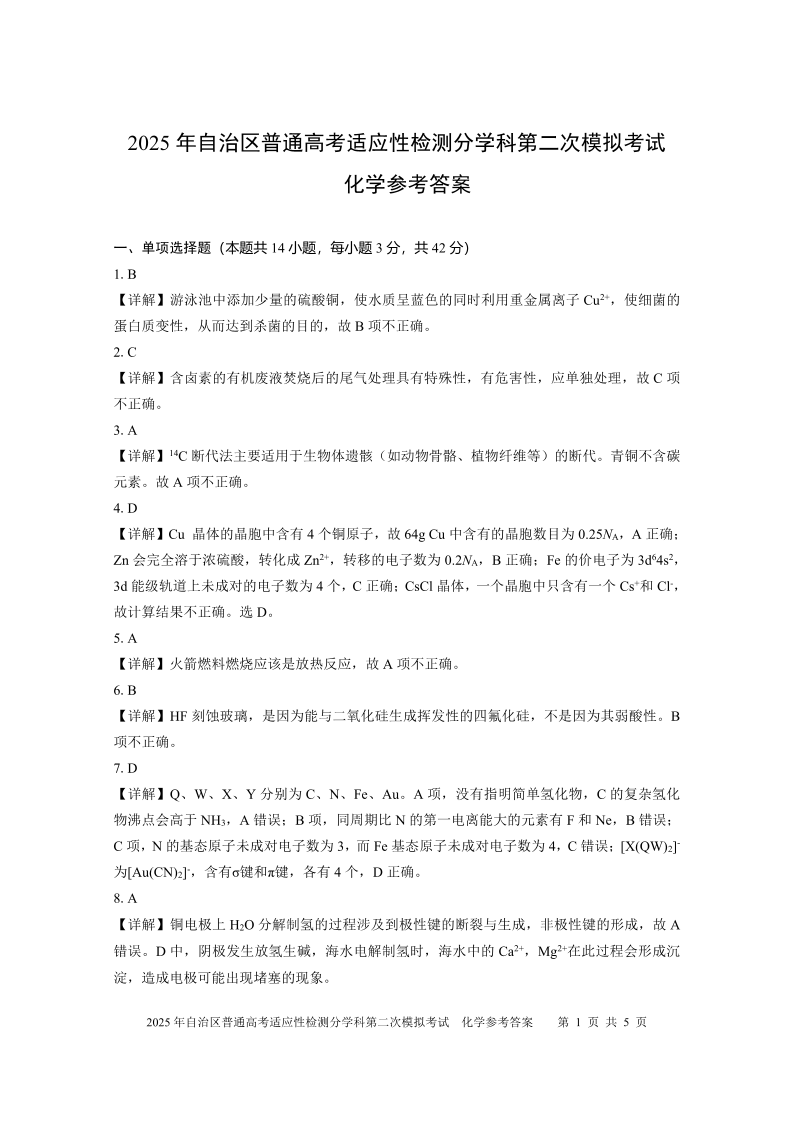 新疆维吾尔自治区2025届普通高考适应性检测分学科第二次模拟考试化学答案