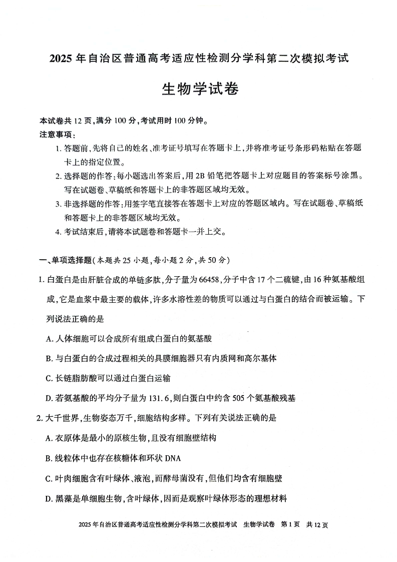 新疆维吾尔自治区2025届普通高考适应性检测分学科第二次模拟考试生物