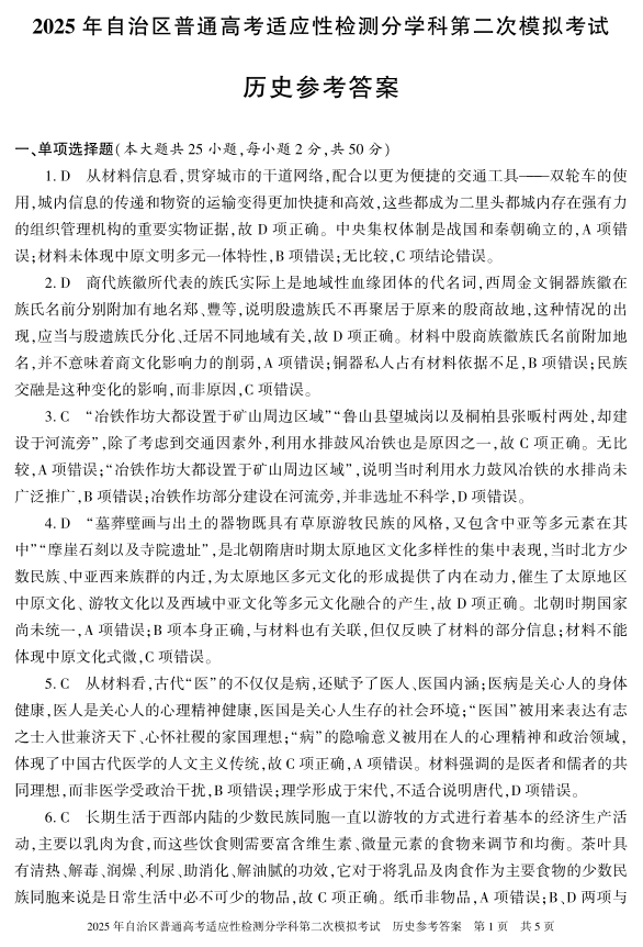 新疆维吾尔自治区2025届普通高考适应性检测分学科第二次模拟考试历史答案