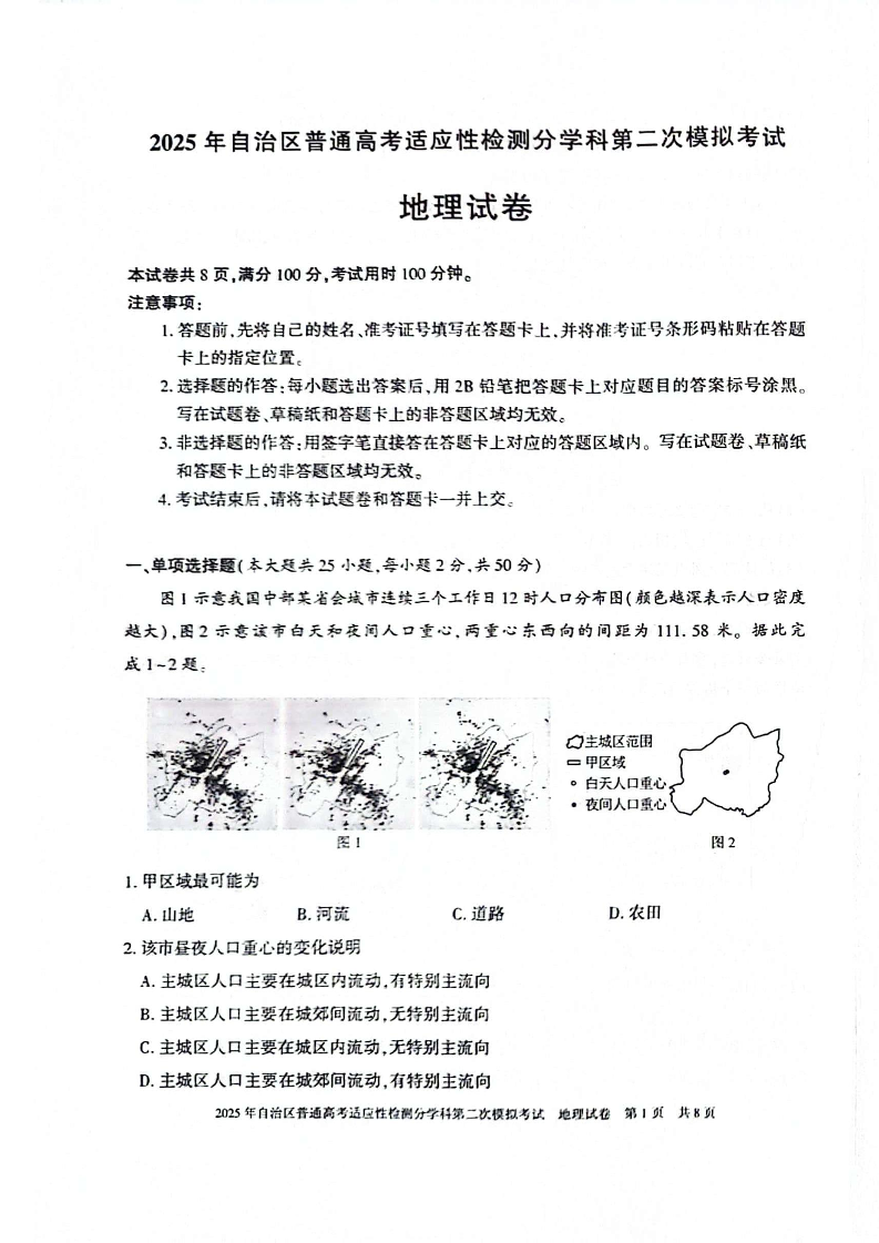 新疆维吾尔自治区2025届普通高考适应性检测分学科第二次模拟考试地理