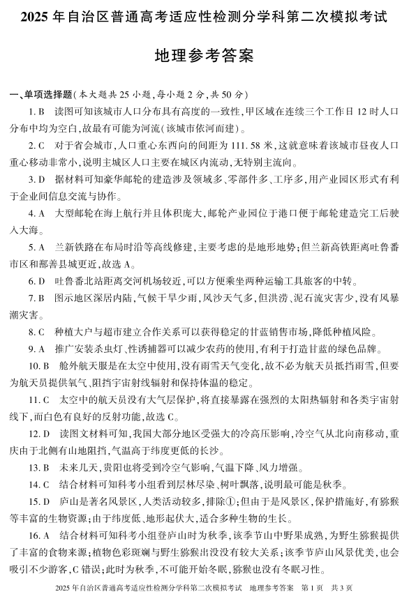 新疆维吾尔自治区2025届普通高考适应性检测分学科第二次模拟考试地理答案