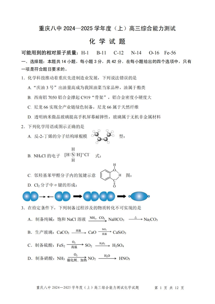 重庆市第八中学2025届高三上学期1月综合能力测试(期末)化学+答案