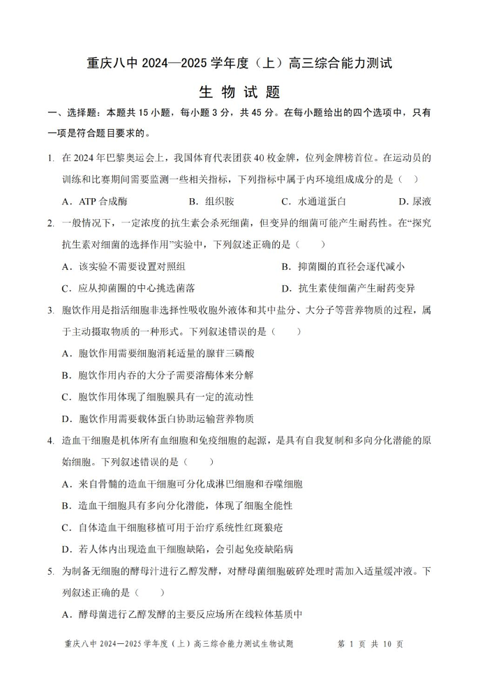 重庆市第八中学2025届高三上学期1月综合能力测试(期末)生物+答案