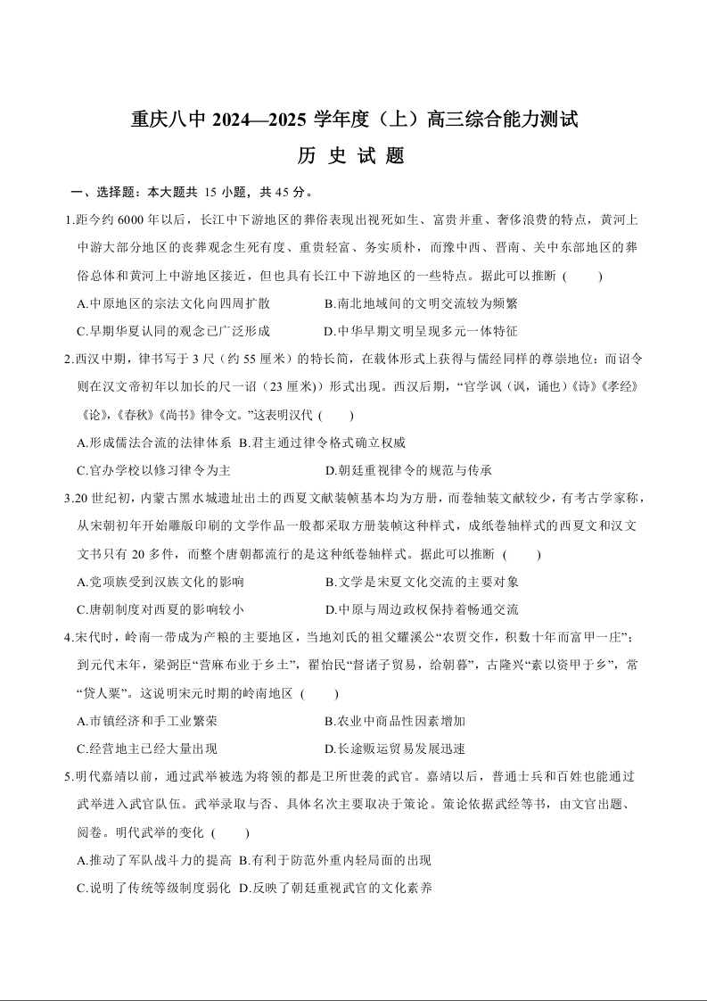 重庆市第八中学2025届高三上学期1月综合能力测试(期末)历史+答案