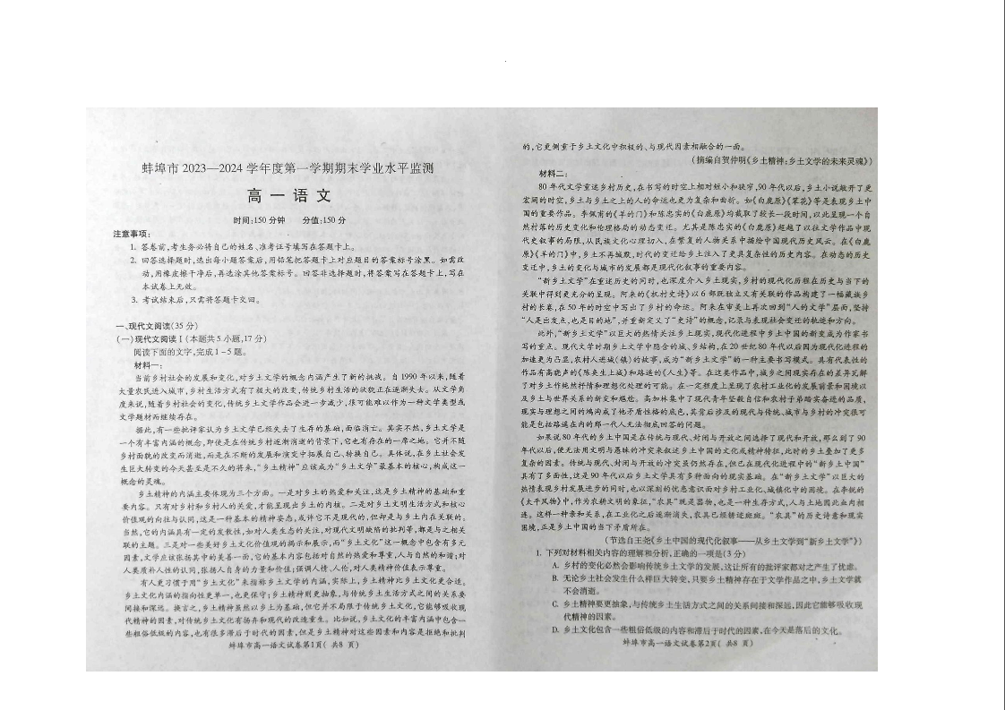 安徽省蚌埠市2023-2024学年高一上学期期末考试语文