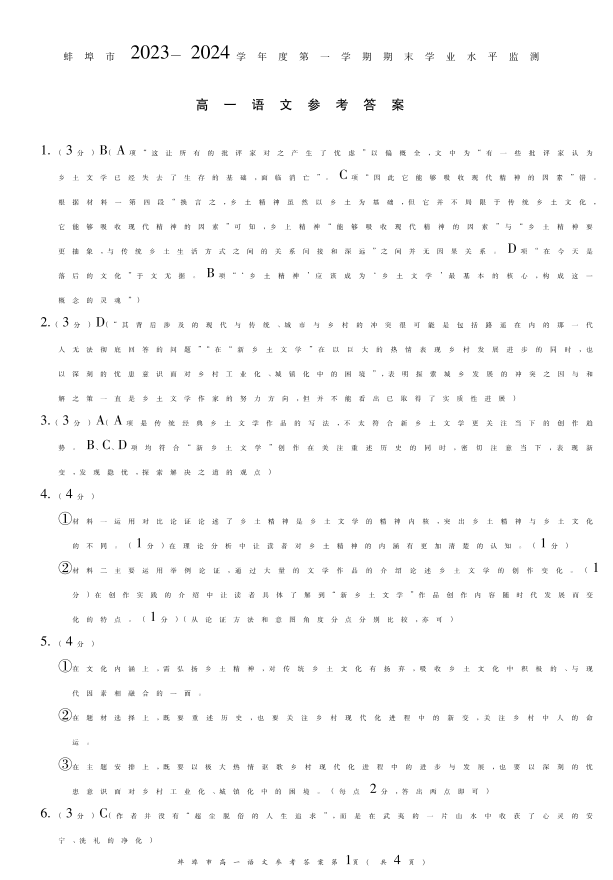 安徽省蚌埠市2023-2024学年高一上学期期末考试语文答案
