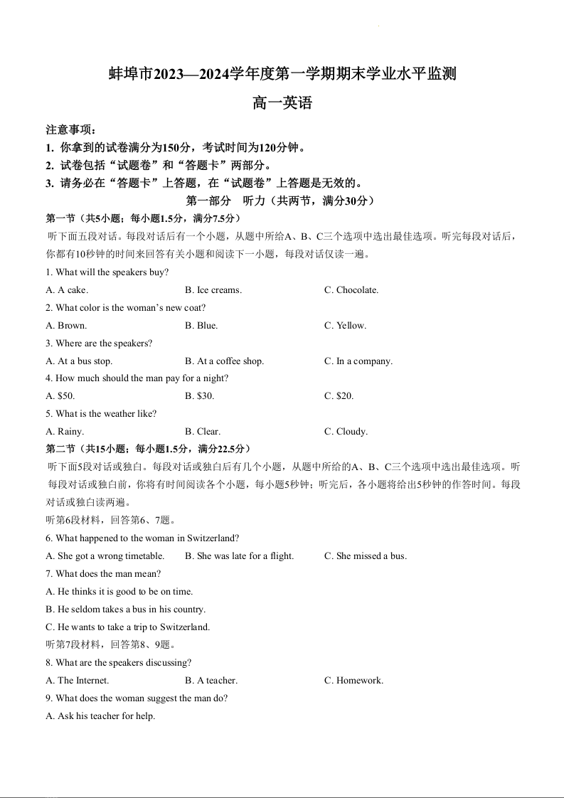 安徽省蚌埠市2023-2024学年高一上学期期末考试英语