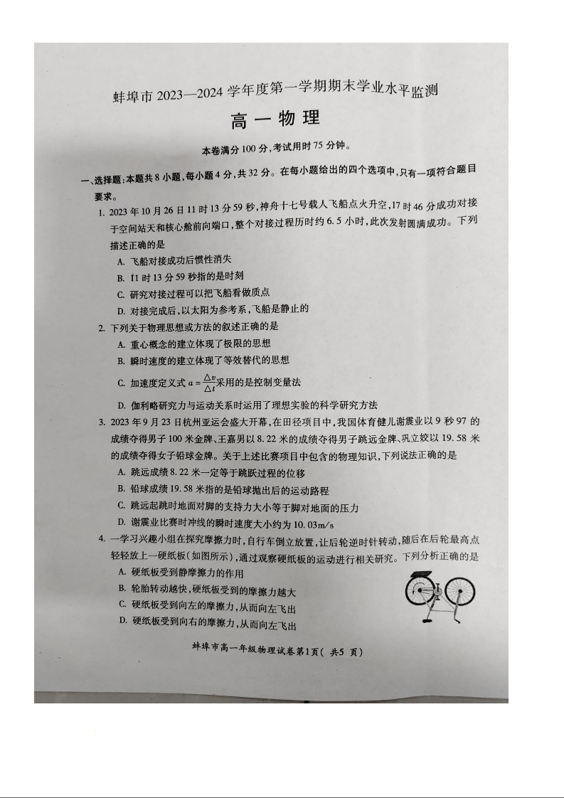 安徽省蚌埠市2023-2024学年高一上学期期末考试物理
