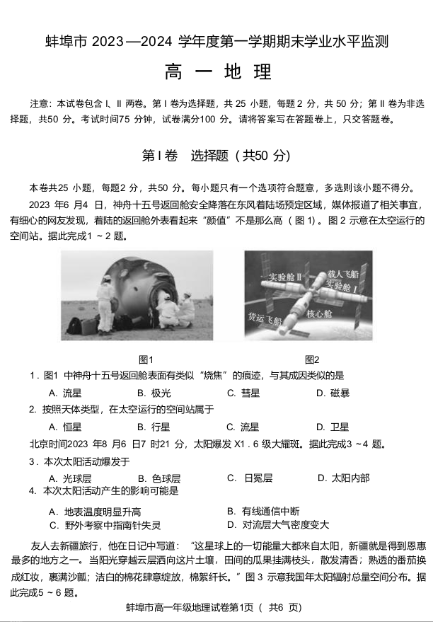 安徽省蚌埠市2023-2024学年高一上学期期末考试地理