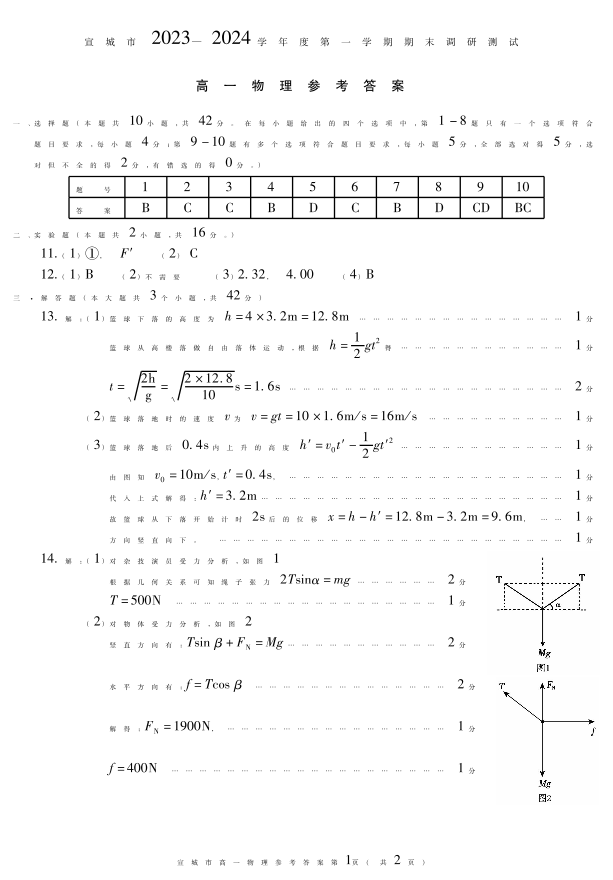 安徽省宣城市2023-2024学年高一上学期1月期末考试物理答案